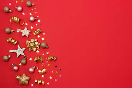 Beautiful festive red background with sparkles and Christmas golden toys. Holiday Content. New year 2020