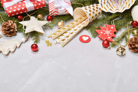 Christmas decorations and fir tree branch and gift boxon dark table. Top view frame with copy space.