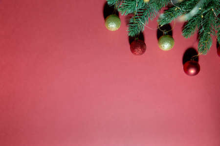 Christmas composition. Christmas red and gold balls decorations, fir tree branches on red background with hard shadows.