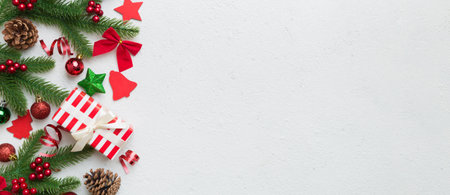 Flat lay border with red christmas decoration, pine branches on a white background