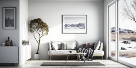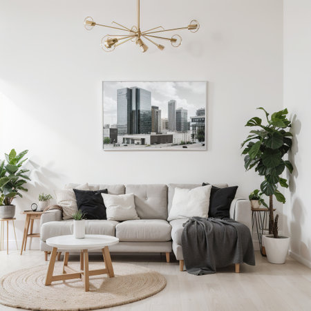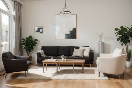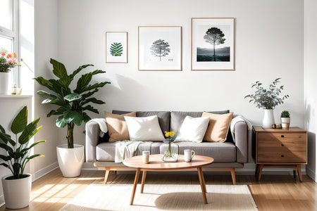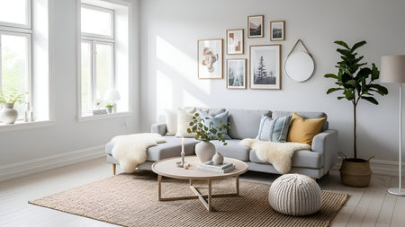 Bright Scandinavian living room interior with modern decor elements