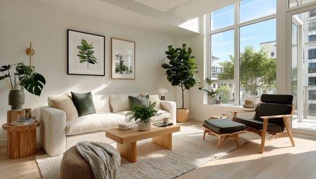 Cozy modern living room with natural light and greenery in urban setting during daytime. Generative AI