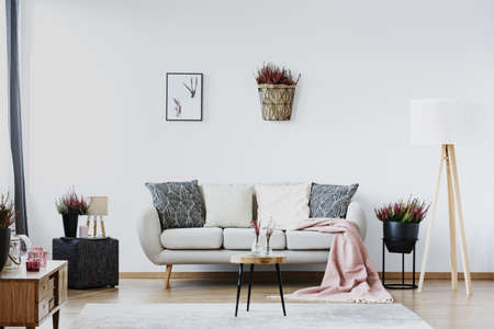 Poster and basket with heather on white wall in cozy living room interior with wooden lamp next to sofa with patterned cushions