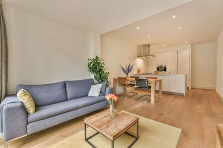Couches and table located near dining area of spacious room in contemporary apartment