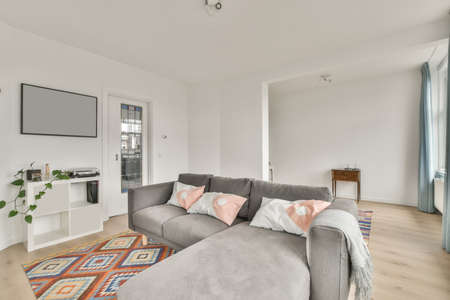 interior of modern bright living room with white sofa, carpet and tv