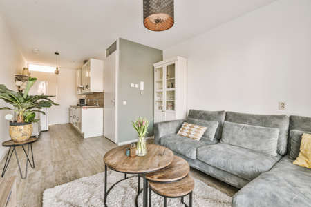 Living room interior with sofa, coffee table, coffee table and plant