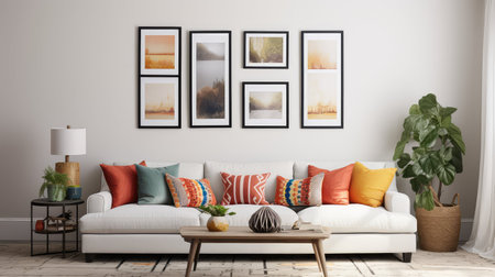 A beautifully designed living room featuring a stylish grey sofa adorned with colorful pillows, framed modern art, and cheerful indoor plants.