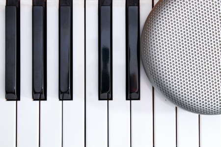 grey stylish speaker on the black and white piano keys on top view