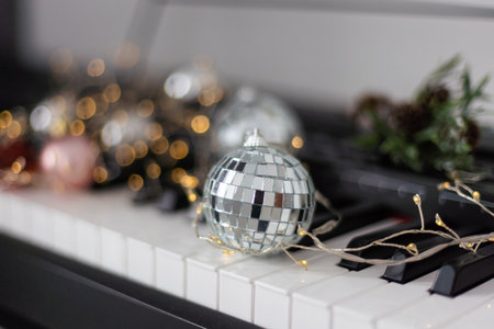 Piano keyboard with Christmas decoration, closeup.