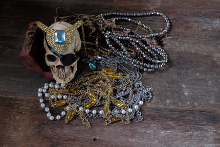 The pirate skull with treasure on wooden background.