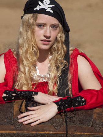 Beautiful young female pirate in red dress.