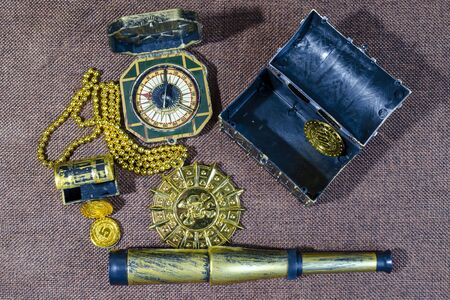 Pirate treasure chest, old mars compass and spyglass