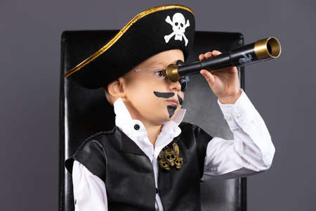Awesome caucasian kindergarden boy with face painted sitting on the black leather chair. He is disguised as a pirate scanning the horizon through . Halloween concept isolated on white background