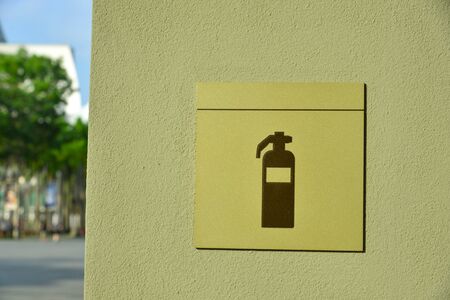 Fire extinguisher sign on the yellow wall in Singapore Downtown.