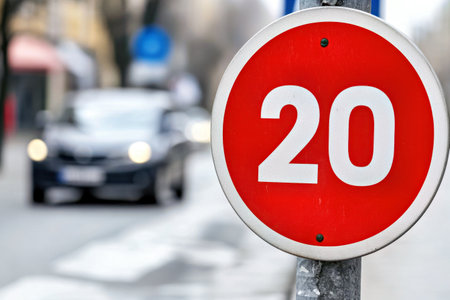 Speed restriction in city. Round speed limit traffic sign. Twenty kilometers per hour, 20 speed limit sign in city street