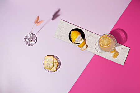 Retro concept stage made with glass, lemon, marble and various objects on dual tone pink background. Minimal art direction. Vintage 70s aesthetic trend shadows. Flat lay.