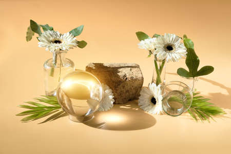 Brick product stand, natural podium. White flowers, exotic leaves seen through water in chemical glass, petri dishes, vials. Reflections, optical distortion. Creative biophilia design.