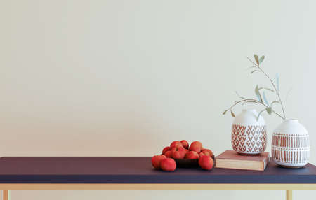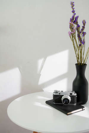 Modern home interior design of living room with ceramic vase, camera and notebook on white circle table with white wall