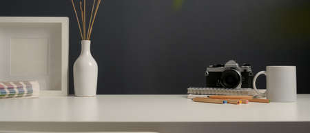 Close up view of worktable with stationery, camera, supplies, mock up frame and decoration in home office