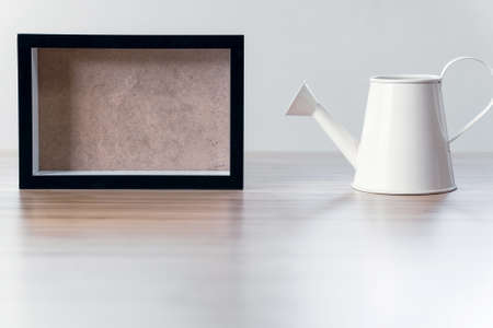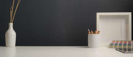 Minimal workspace with copy space and mock up frame on white wooden table and white wall background