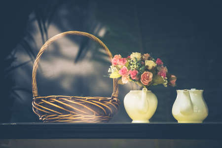 Teapot vase with basket decorated in coffee shop, shot taken outside through the mirror