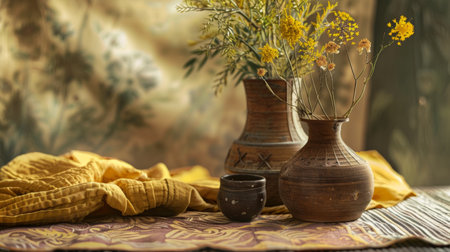 Two rustic pottery vases filled with dried flowers placed on a patterned cloth, surrounded by warm tones in a cozy, vintage-inspired setting.
