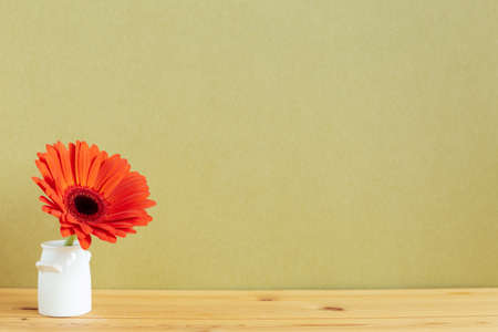 Orange gerbera flower in vase on wooden table with khaki background. copy space