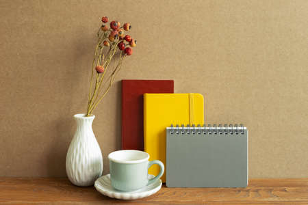 Mockup workspace desk and copy space book,plant and coffee on wood desk.