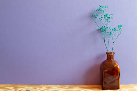 Vase of green baby's breath, gypsophila dry flowers on wooden table. purple wall background. home interior