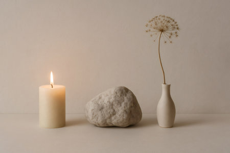 Lit candle, rock and dry flower in vase creating a minimalist still life composition on a white surface