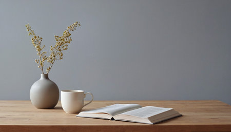 Still Life of coffee cup and envelope and ceramic vase with dry plant. gray background