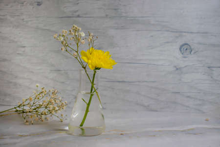 Spring flower arrangement of yellow flowers in a vase on a yellow background soft focus floral concept with copy space