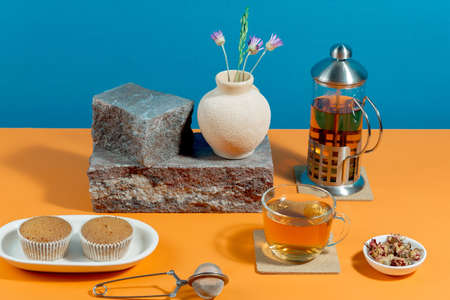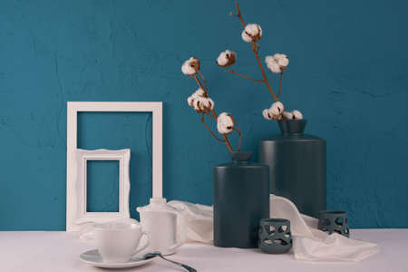 a cup with coffee and a teapot and two vases with a cotton plant on a blue background on the table