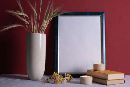 vintage books, candles are burning, white vase with ears of wheat, blue photo frame on a red background on the table