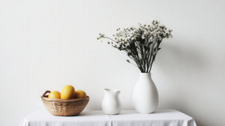 Minimal workspace with copy space and ceramic vase decorations on white table and white wall background