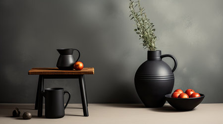 A minimalistic still life showcasing stylish vases, a decorative clock, and a textured ball with delicate branches, set against a simple neutral backdrop.