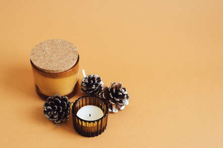 Dried lavender in a small vase, aroma candles and decorative pine cones on orange background