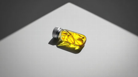 Vitamin D3 gelatin capsules on a white background. The fat-soluble solar vitamin cholecalciferol glows yellow and glistens. Place for text