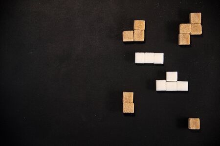 Cubes of white and brown sugar arranged in tetris shapes with black background and copyspace