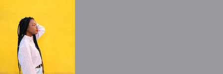 Banner with young beautiful afro american woman in the street.