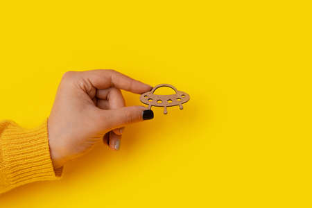 wooden UFO in hand over yellow background