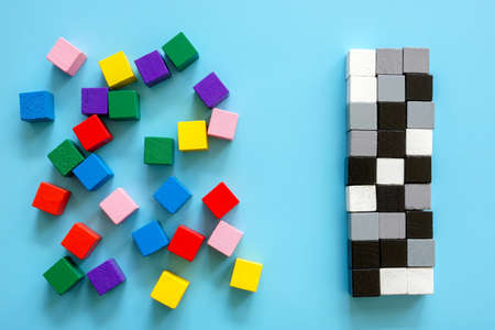 Colored cubes and a line of black and white cubes. Diversity and inclusion concept.