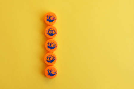 KHARKOV, UKRAINE - NOVEMBER 24, 2019: Many orange caps with fanta logo on yellow background
