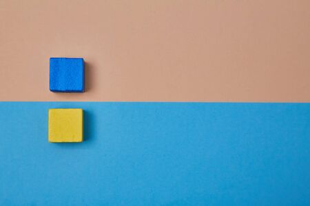 Wooden cubes mockup with copy space for inscription design. Yellow, blue blocks stands nearby in line, place for text