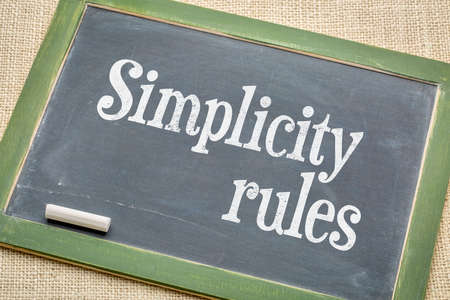 simplicity rules sign - white chalk text on a vintage slate blackboard against burlap canvas