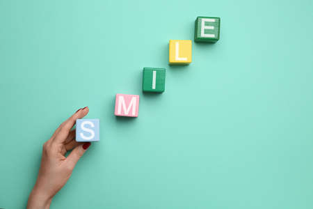 Female hand and cubes with word SMILE on color background