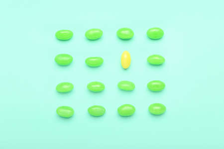 Different jelly beans on color background. concept of uniqueness