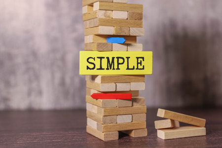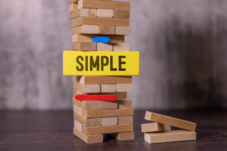 Stack of wooden blocks with a sign that says 'SIMPLE' in yellow. Some blocks are on the floor.