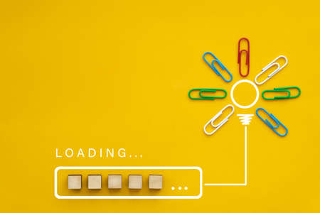 Loading bar almost complete with idea beeing processed on a light bulb on yellow background. Business concept growth success process.