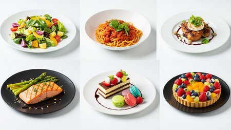 A six-image collage showcasing elegant dishes including a fresh salad, pasta, grilled salmon, steak, a slice of cake, and a fruit tart.